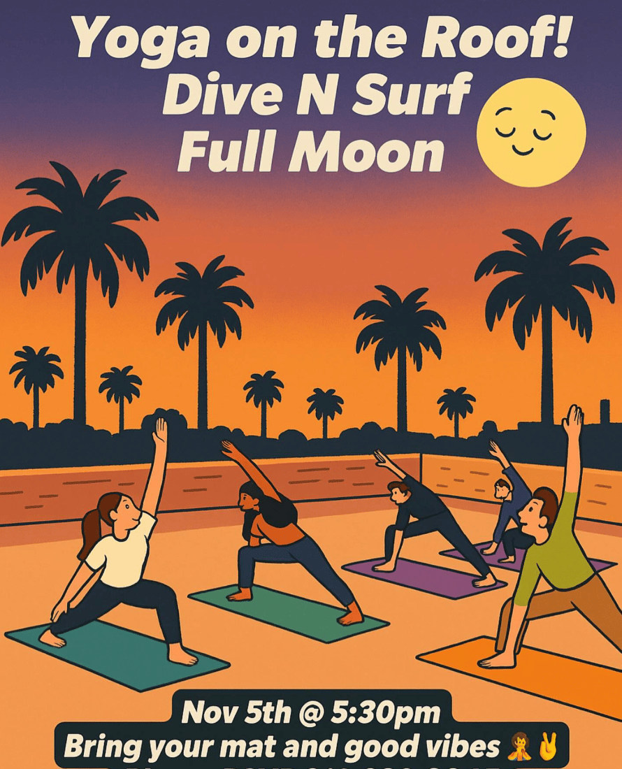 Flow under the moonlight at Dive N Surf’s rooftop yoga session. This open-air evening class welcomes all levels for a peaceful practice set to the glow of the full moon. Bring your mat, a sweatshirt, and some good energy, it’s one of those South Bay moments that just feels right.