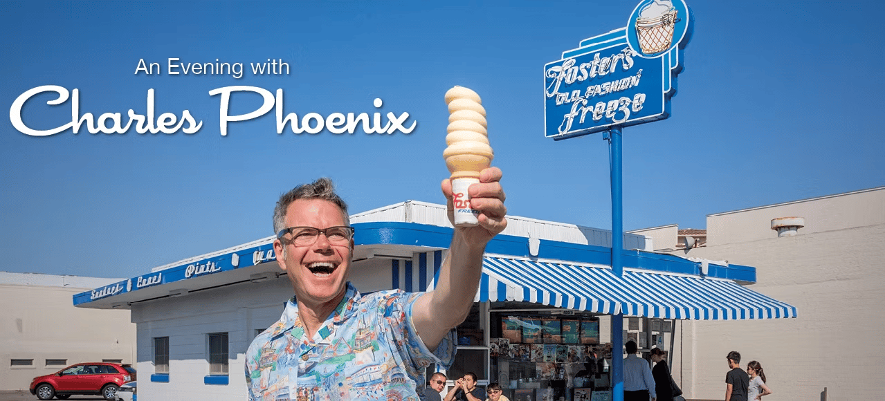 Pop-culture icon Charles Phoenix brings his laugh-out-loud live show to Torrance – celebrating vintage America with hilarious slides, stories, and nostalgia.